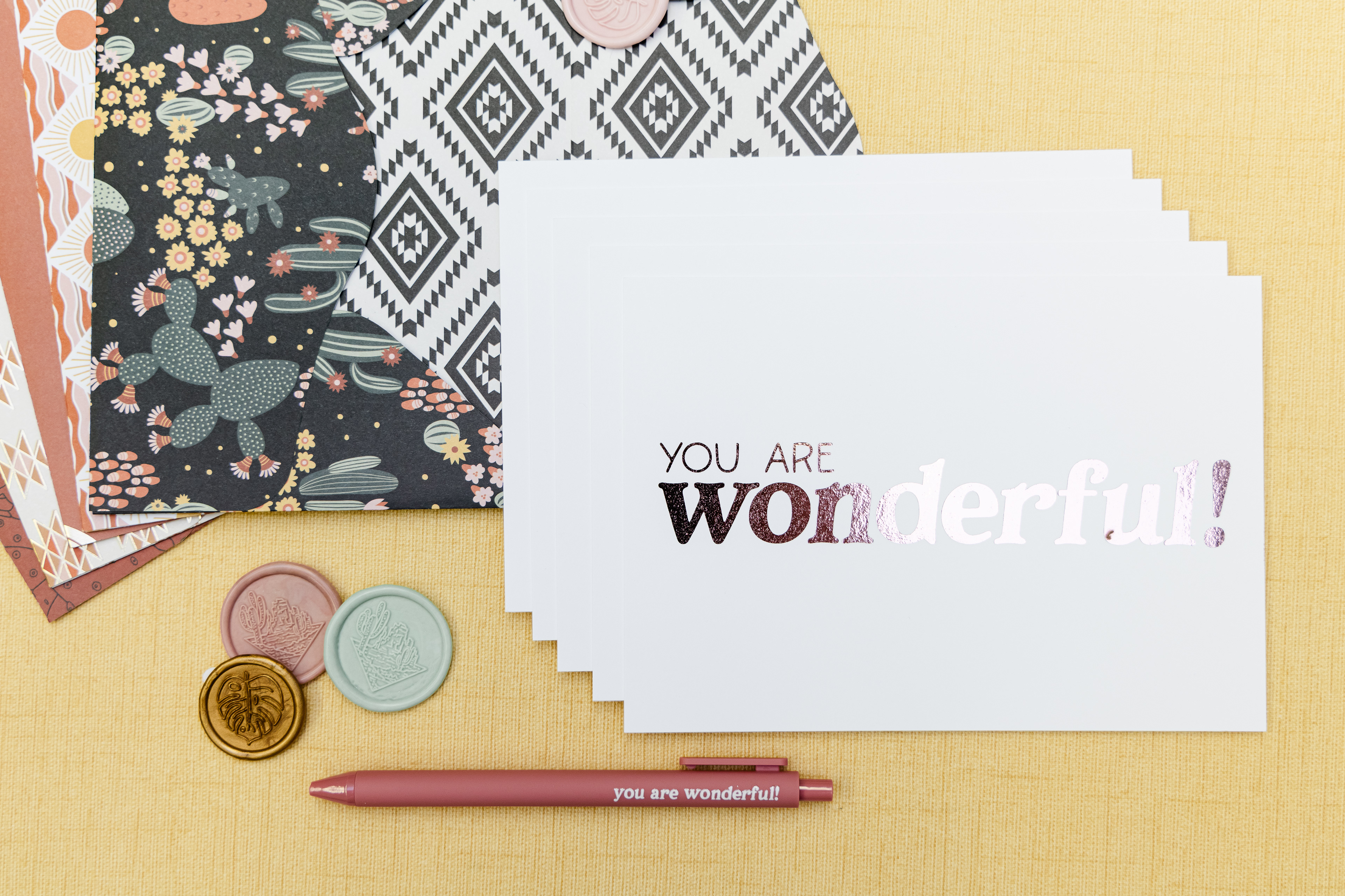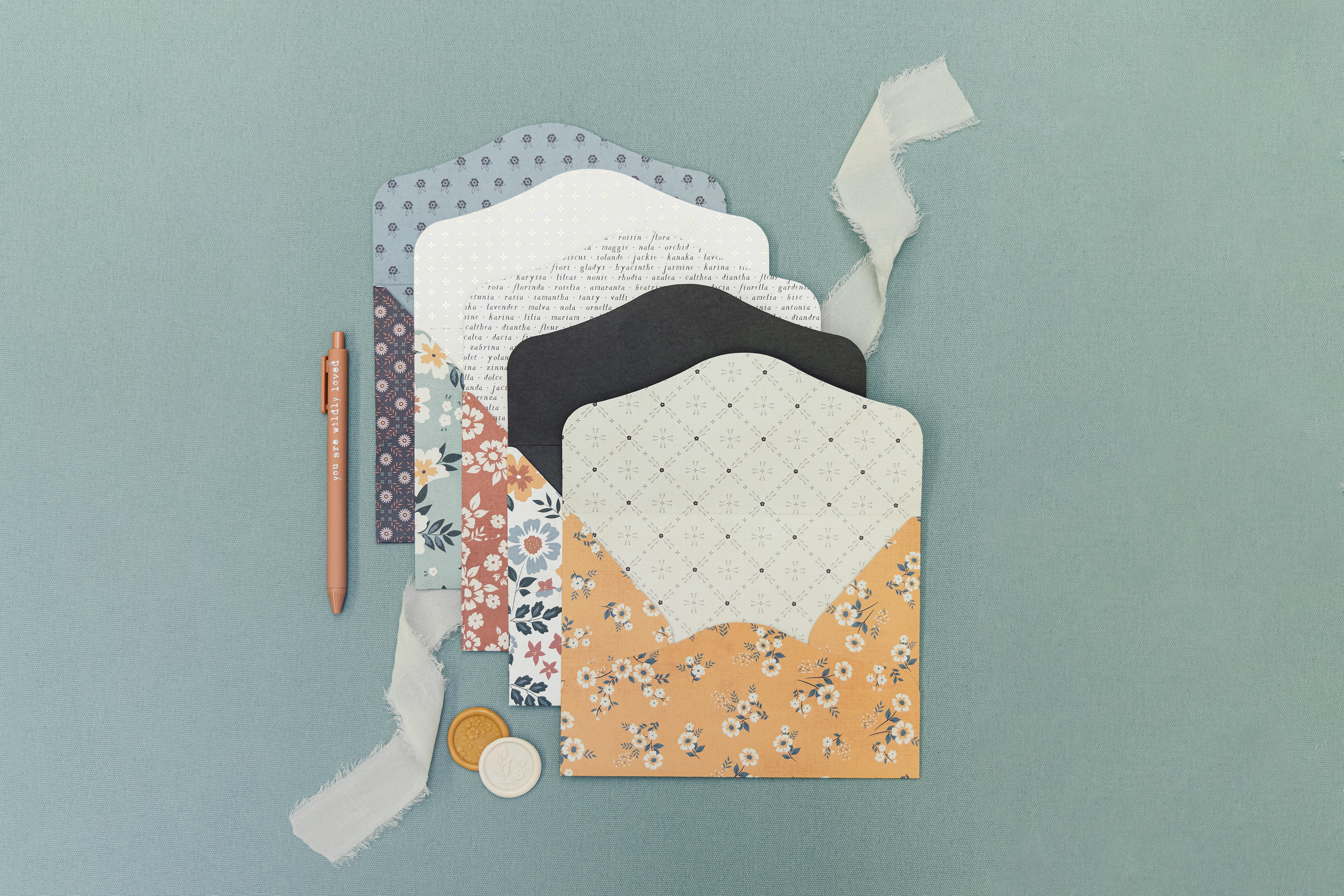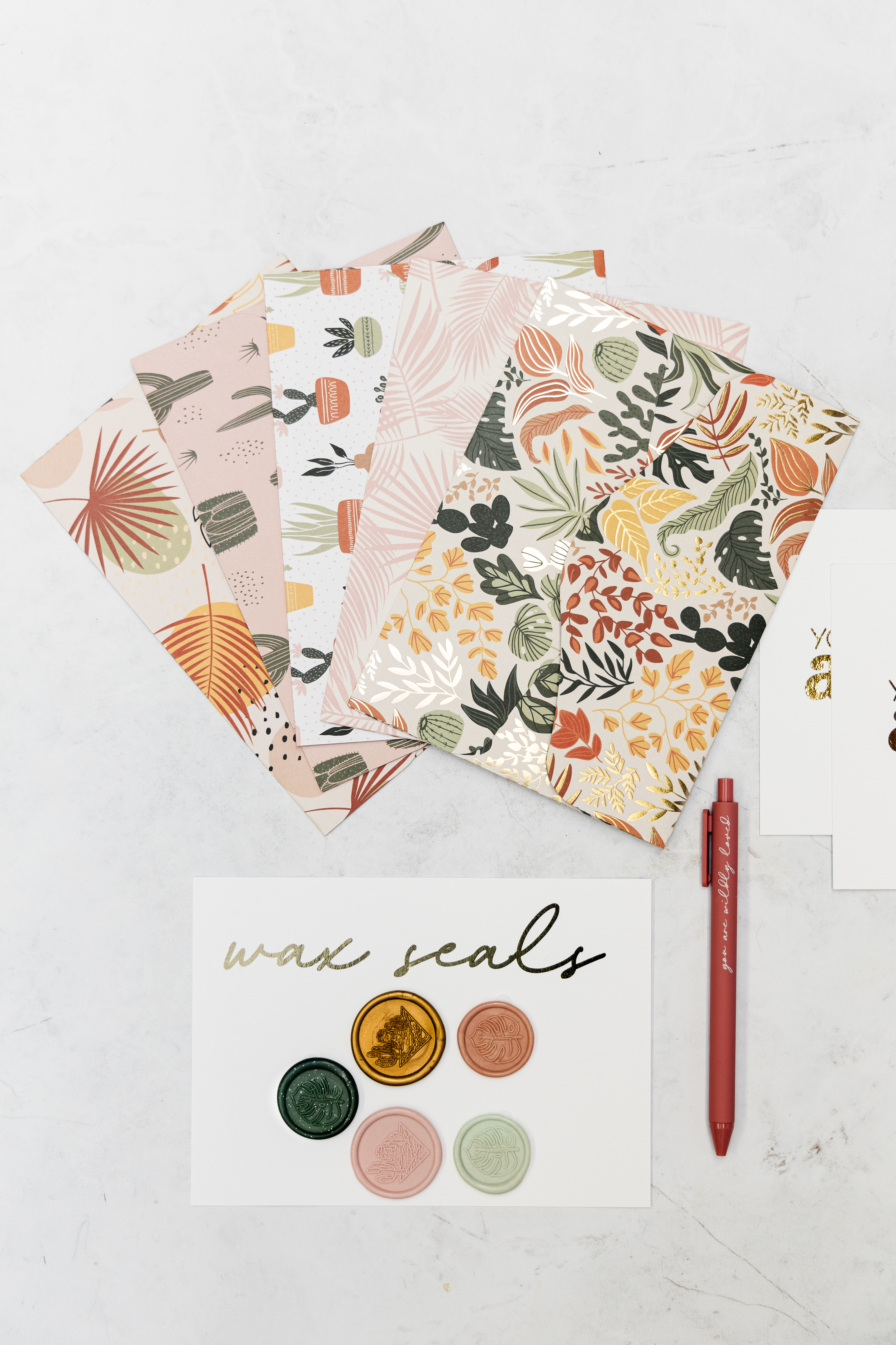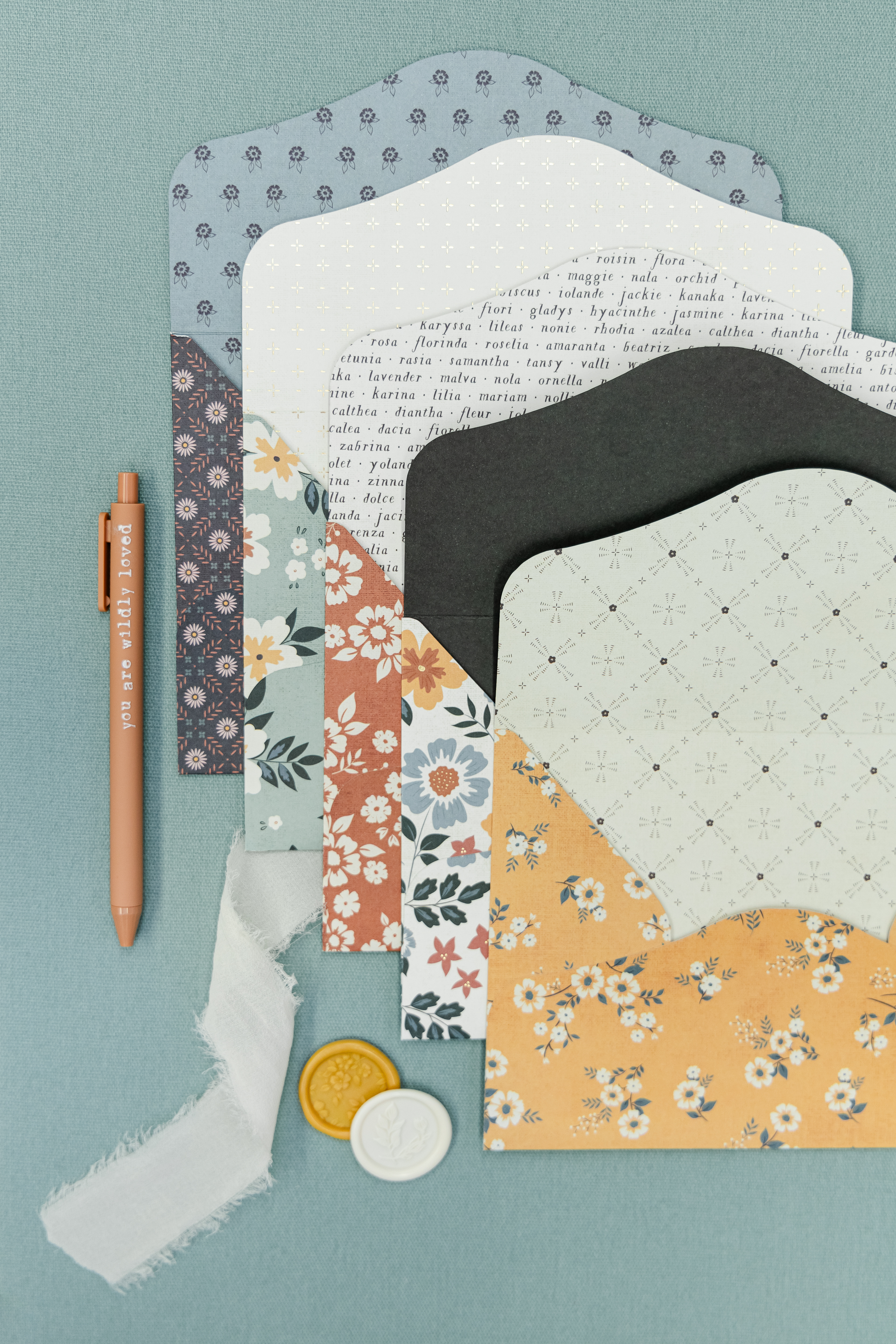 Welcome to Wildly Loved Paper Co! These limited edition, handmade envelope sets are created from carefully curated double-sided paper and made to be sealed with hand poured wax seals. Use the included foiled flat, single-side greeting cards, your own 5x7 greeting card or a 5x7 photo card and mail in the included outer envelope. Each set comes in handmade boxes tied up with chiffon ribbon. If cards are not being mailed, an included removable label can be used to write the recipients name.